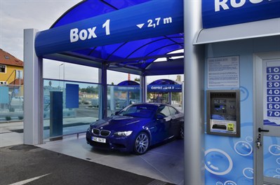 dvojitým sušením, vedle ní stojí čtyři samoobslužné mycí boxy firmy