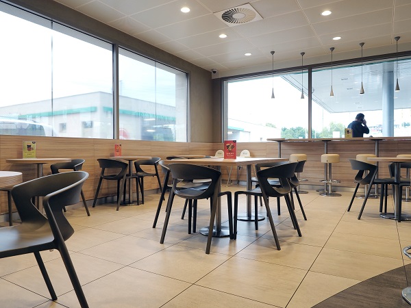 pokladny a pulty pro výdej bistra. Posezení oddělené barovým pultem