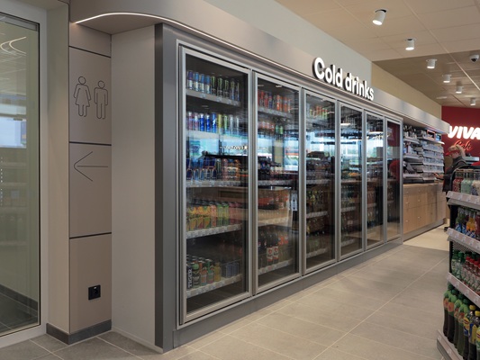 rozmístěné regály obchodu, které doplňují chlazené skříně podél